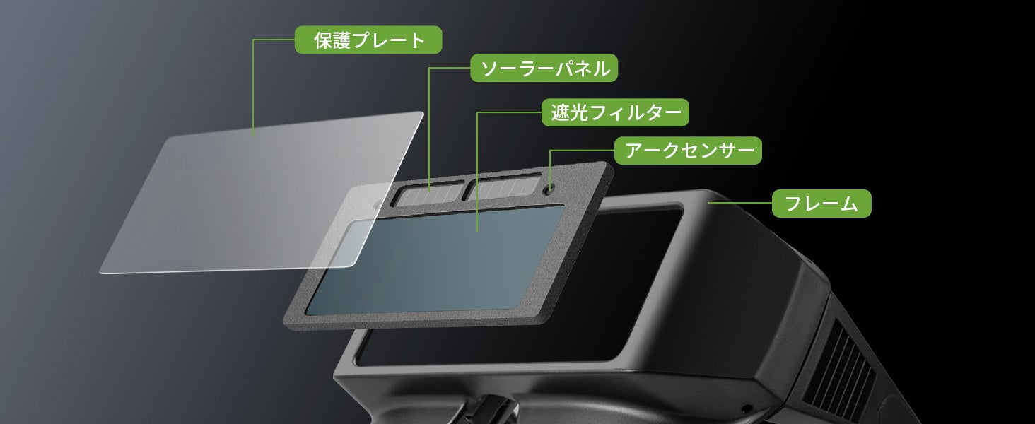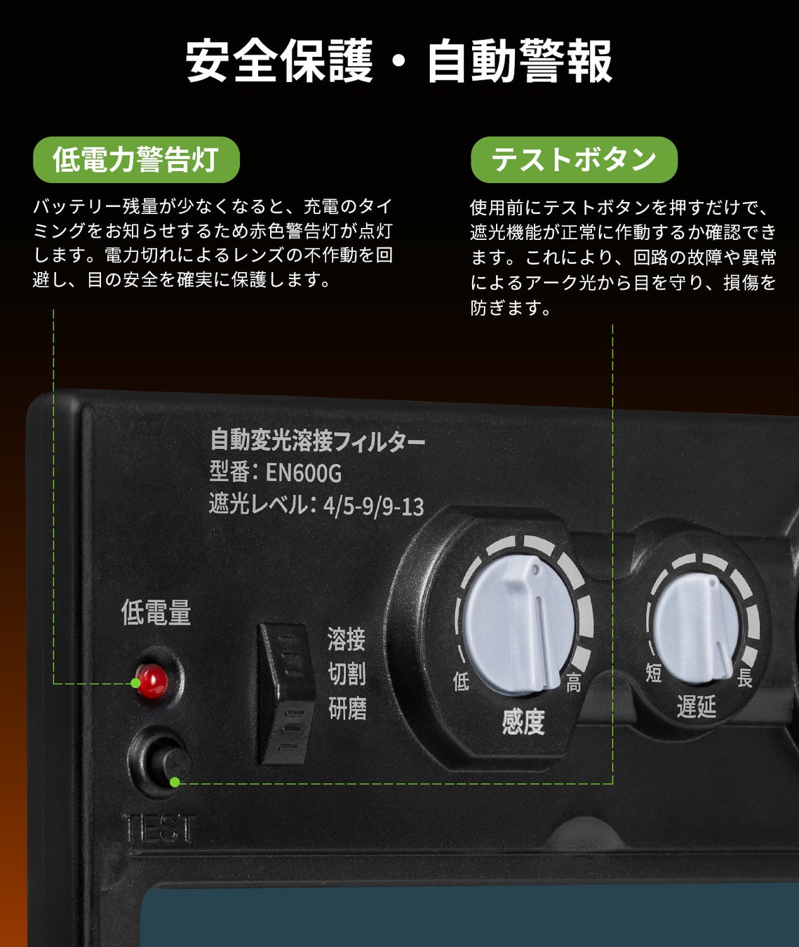 遮光機能の動作確認が可能なセルフテスト機能と、電池残量を知らせるインジケーターを搭載。常に安全な状態で作業できます。