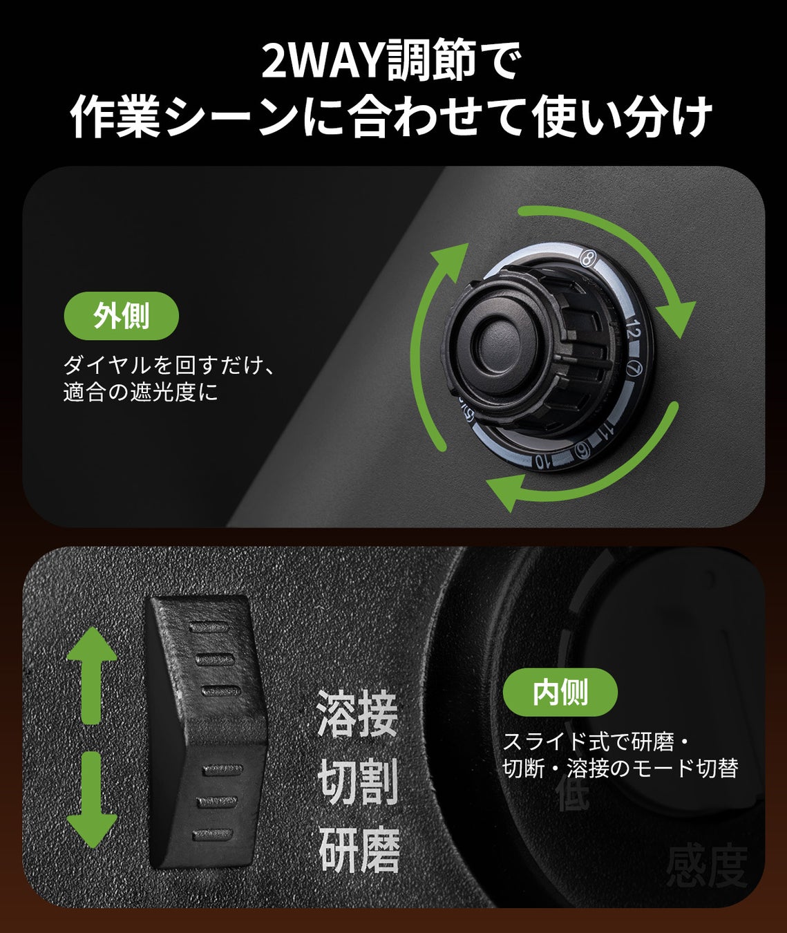 外部ノブで遮光度を手動調整できるほか、内部スイッチで溶接/切断/研磨の3モードをワンタッチ切替。作業内容に応じて最適な暗度を自動調整します。