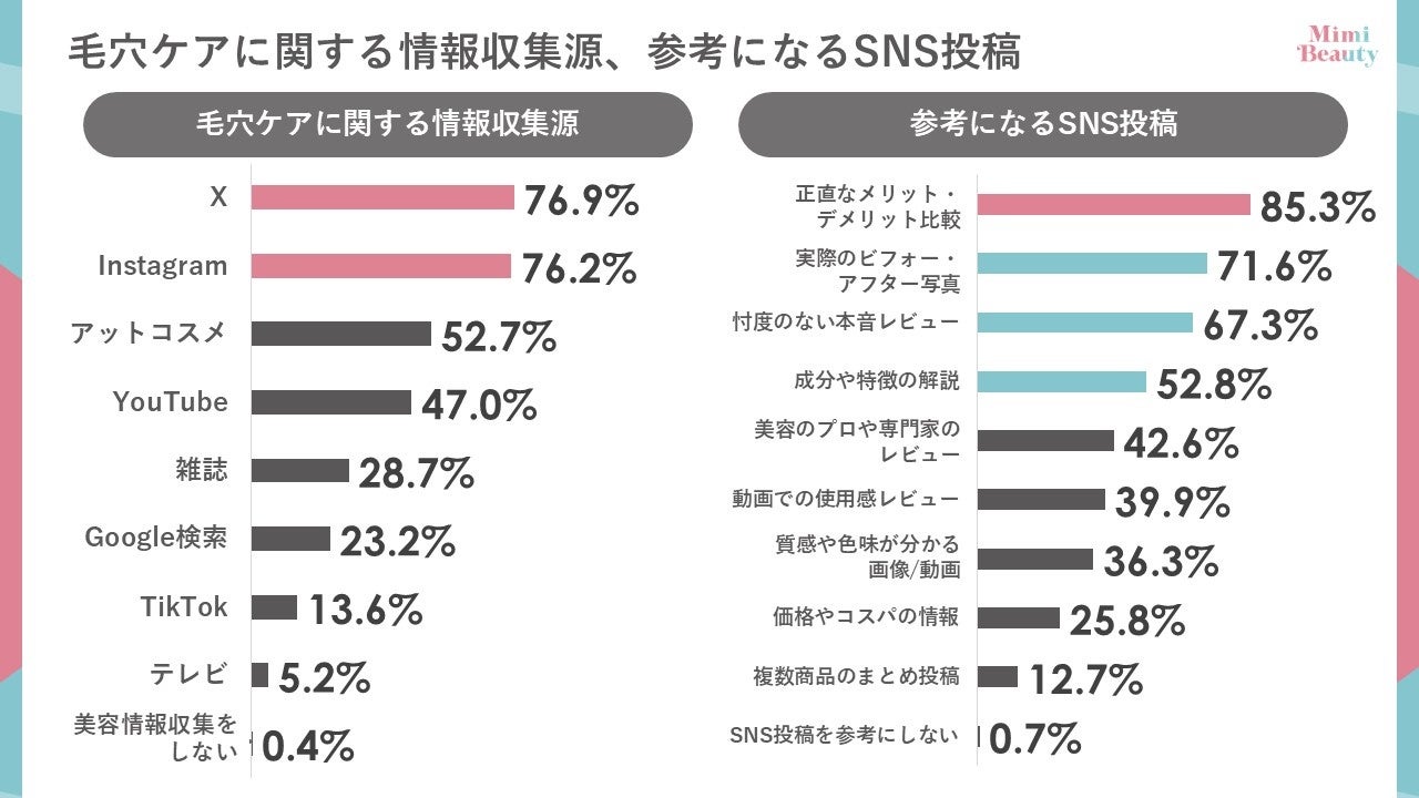 毛穴ケアの情報源は「X」、「Instagram」、参考になる投稿は「正直なメリット・デメリット比較」、「ビフォー・アフター」、「成分解説」