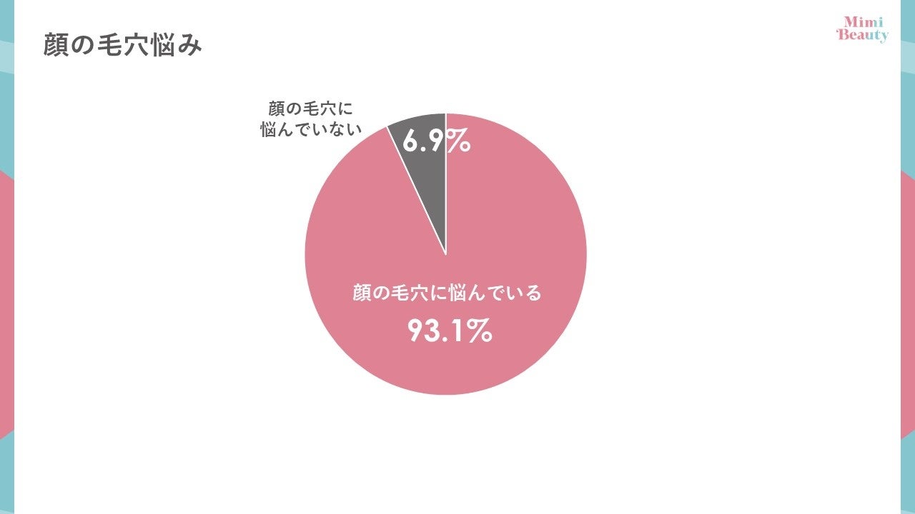 まず、毛穴悩みの有無について調査したところ、実に93.1%が顔の毛穴に悩んでいると回答しています。