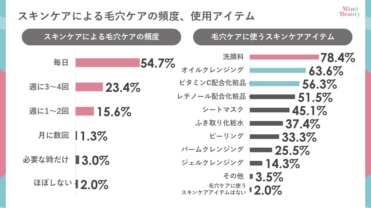 最も実践者の多い「スキンケアによる毛穴ケア」について、頻度を聞いたところ「週1回以上」と回答した人の合計は93.7%にのぼりました。「毎日」と回答した人も54.7%と半数を超えていることから、毛穴ケアは日々のスキンケア習慣として根付いていることが分かります。さらに「毛穴ケアに使うスキンケアアイテム」についても調査したところ、最も使用されているのは「洗顔料」、次いで「オイルクレンジング」、「ビタミンC配合化粧品」という結果でした。