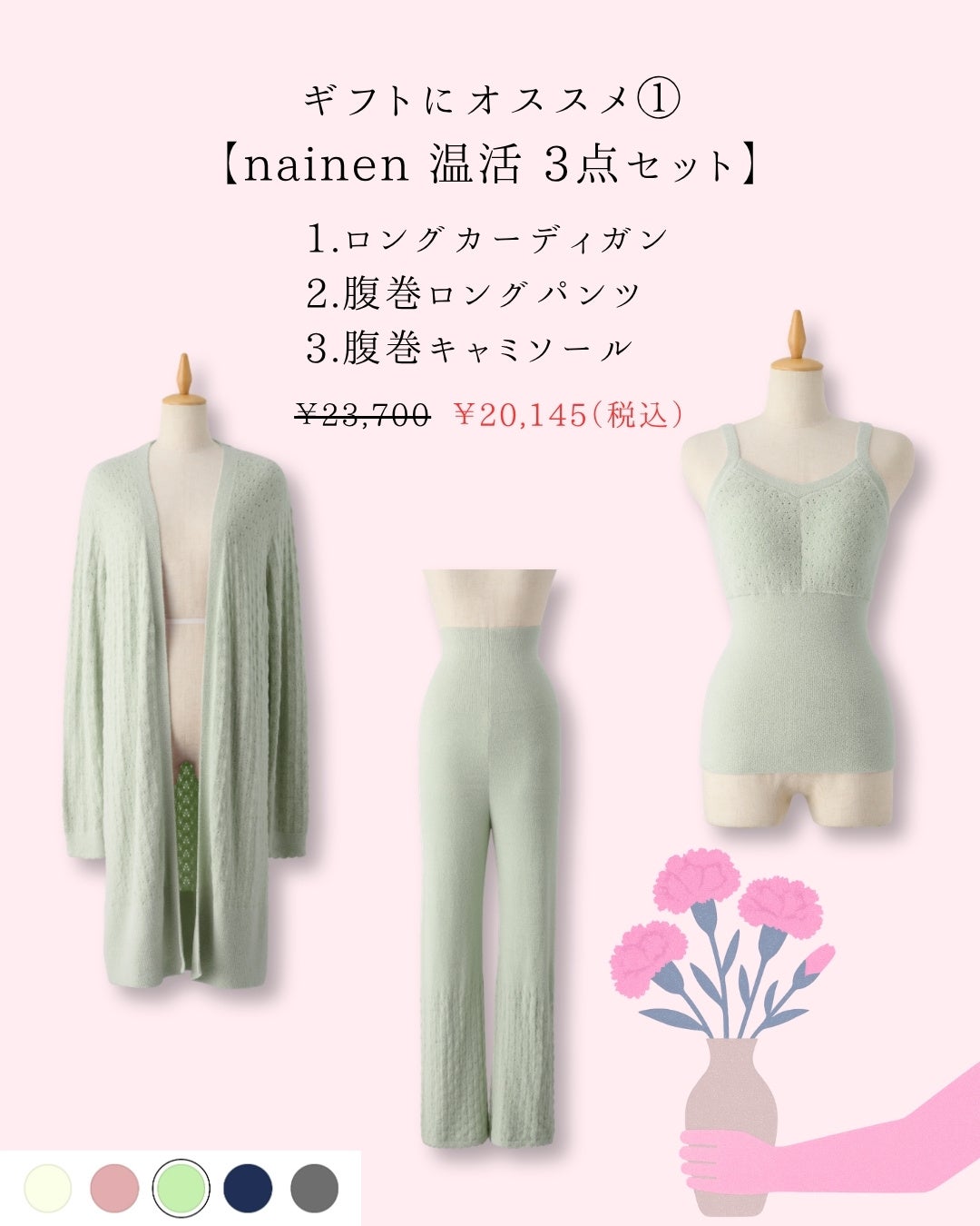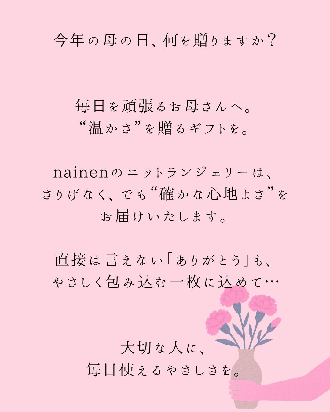 “体温を1℃上げる”ニットランジェリーブランド「nainen(ナイネン)」を展開する株式会社 Hana Plan(ハナ プラン 本社:東京都港区 代表取締役:花村 幸栄 )は、母の日の企画として「母と娘のnainenおそろい2点セット」をご用意しました。