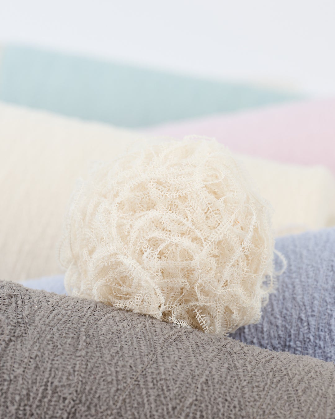 (1)シェニールヤーン糸(セラミックスを練りこんだ羽根のような糸なので空気を含んで柔らかい)