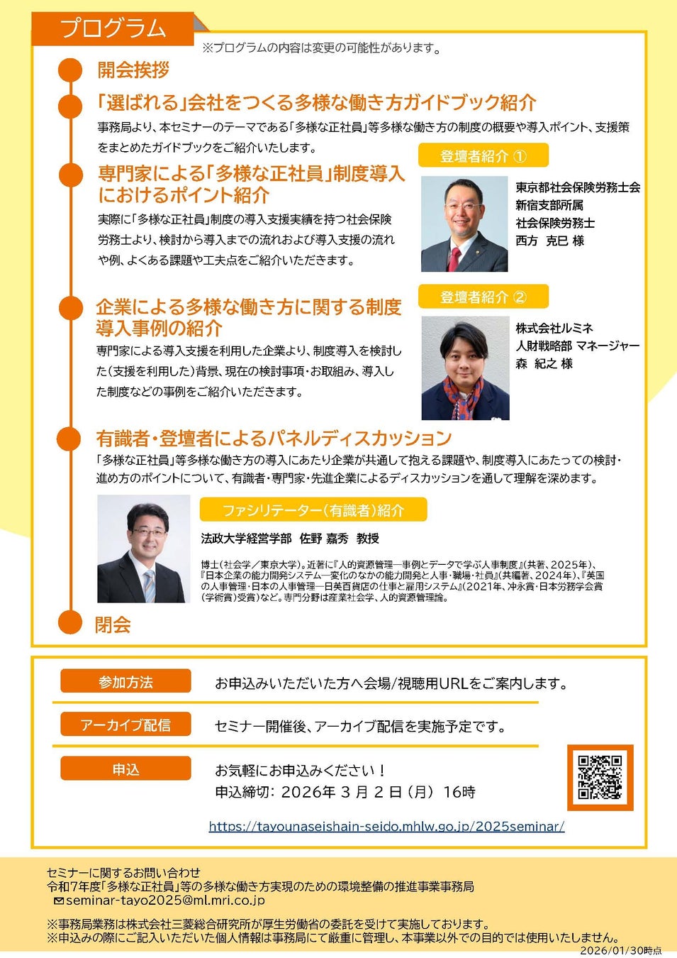 対象者 :「多様な正社員」制度等多様な働き方にご関心のある事業主・人事労務担当者等の皆さま、企業等に対して制度導入等を支援されている皆さま など