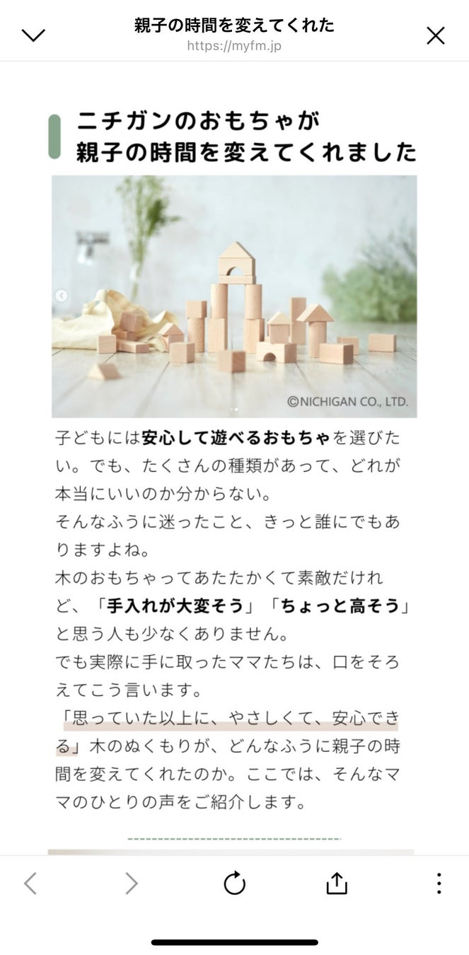ニチガンから発売される商品の最新情報に加えて、年齢と伸ばしたい能力別に診断できる”おもちゃ診断”や、実際にニチガンのおもちゃを選んでいただいた方のお声を”育児ストーリー”にて配信中です。