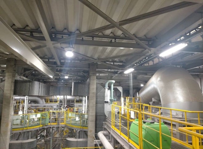 清掃工場のごみピットは、家庭ごみや産業廃棄物が一時的に大量に貯められるエリアであり、酸性・アルカリ性ガスが発生し、腐食のリスクが高い環境です。これに対応するため、当社はフッ素粉体焼付塗装を施したLED高天井照明を開発しました。
