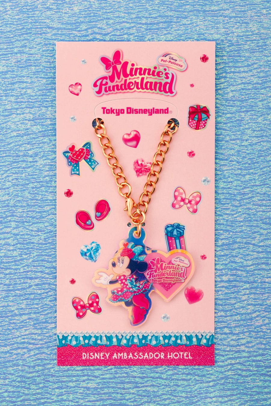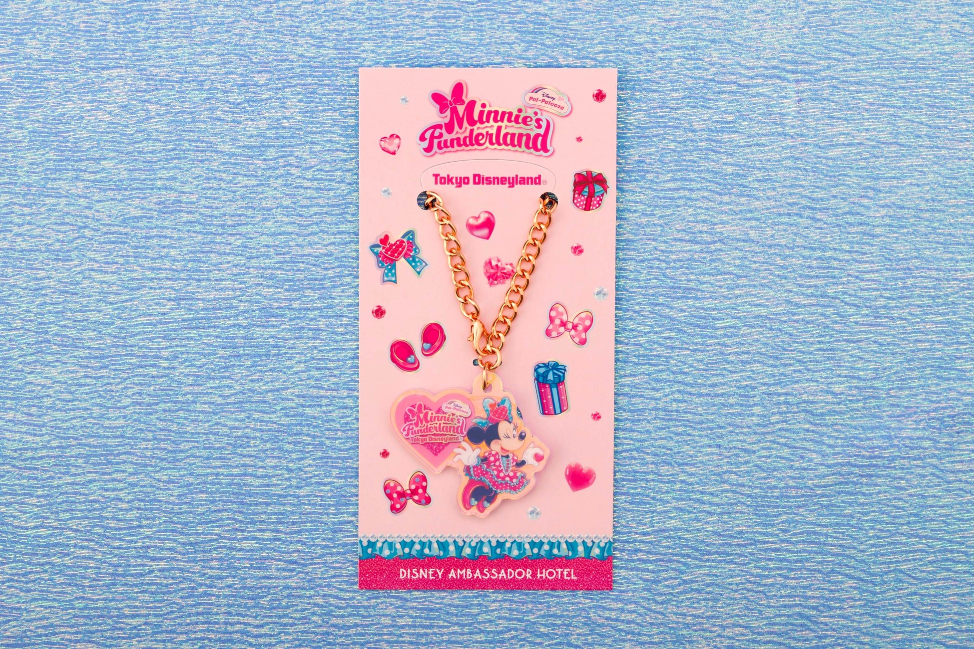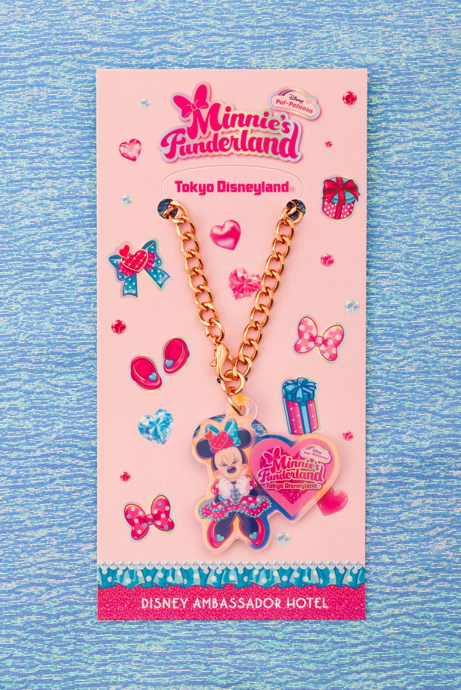 また同期間、東京ディズニーランドホテルにご宿泊の方がご購入いただける、カードキー&キーケースをご用意します。客室の扉を開けるたびに胸がときめくようなカードキーと、ミニーが夢に描いた世界で身に着けているリボンをモチーフにしたキーケースは、滞在中の気分をさらに盛り上げます。キーケースを頭にかざして、ポップでキュートな世界を楽しむミニーになりきってみてはいかがでしょうか。