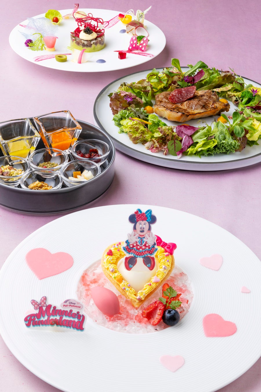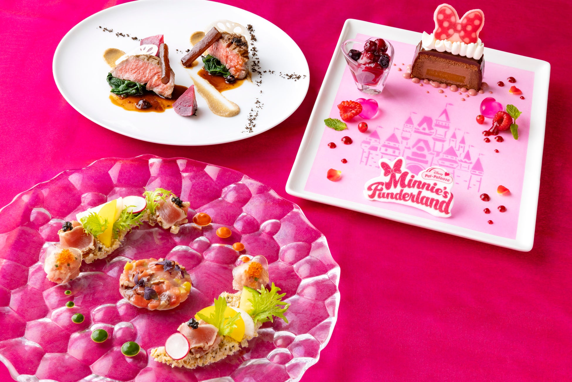 東京ディズニーランドホテルとディズニーアンバサダーホテルのすべてのレストランでは、“ミニーのファンダーランド”の世界を表現した見た目も楽しめるスペシャルメニューが登場し、お食事のひとときを華やかに彩ります。