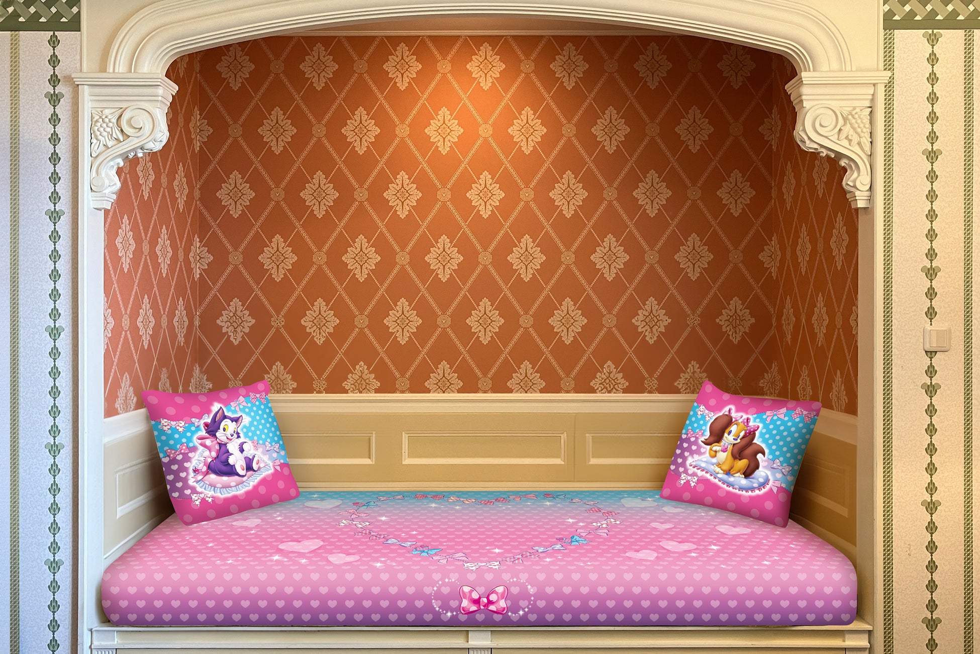 壁のくぼみを使用したアルコーヴベッドには、ミニーが大好きなドット柄がデザインされたベッドカバーやミニーと仲良しのフィガロとフィフィが描かれたクッションがあしらわれています。アルコーヴベッドで眠りにつけば、夢の中でも“ミニーのファンダーランド”の世界が続くかもしれません。