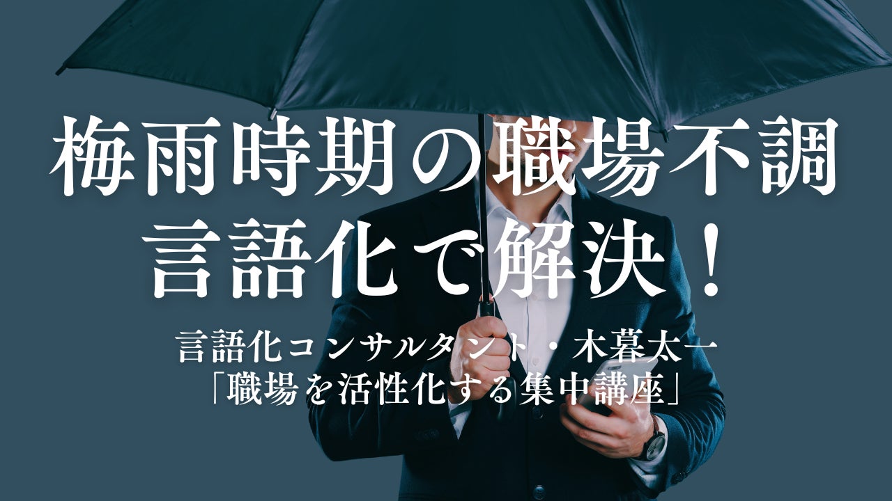 一般社団法人教育コミュニケーション協会(所在地:東京都品川区、代表:木暮太一)は、梅雨時期に多くのビジネスパーソンが経験する「なんとなく不調」が職場の生産性低下やストレス増大に繋がる実態を受け、本日、2025年6月11日(水)から7月31日(木)までの期間限定で、特別講座「職場を活性化する言語化集中講座」を緊急開催します。これは、67冊の著作を持つ、言語化コンサルタントの木暮太一が講師を務め、従来の「言語化プログラム研修」のエッセンスを凝縮し、梅雨時期特有の心身の不調と、それに伴う職場の「言えないストレス」を解消することに特化した実践型プログラムです。