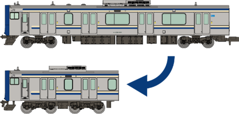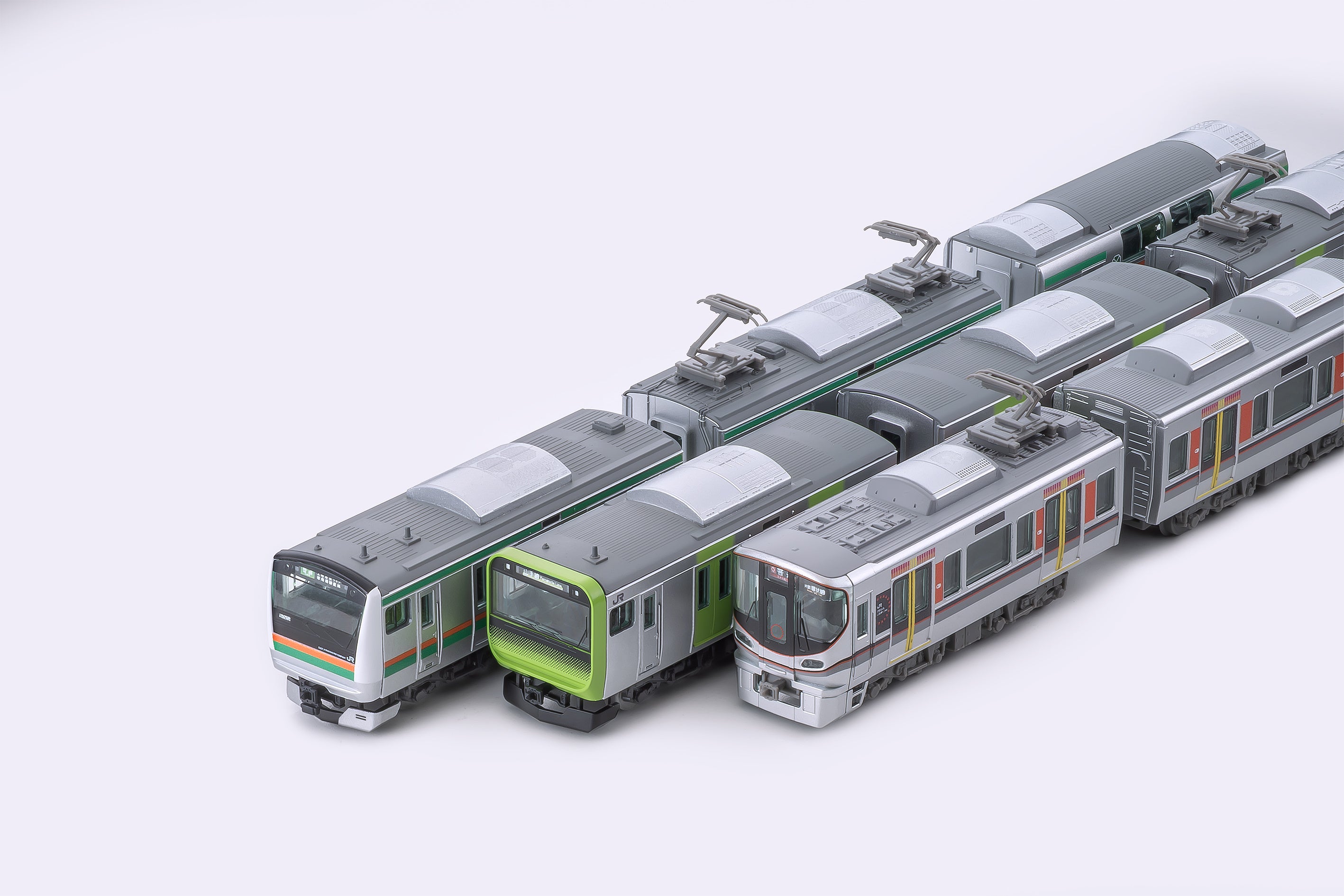 実車の1/150スケールを基本に、車体の長さ方向のみを実物の約半分にしており、省スペースで並べて飾ることができます。Nゲージサイズの彩色済み組立キットとして提供され、別売の動力ユニットを組み込むことでNゲージの線路上を走行させることも可能です。また、台車部分は展示時のリアルな見映えを重視した4軸仕様と、走行用に最適化された2軸仕様を選択でき、用途に応じて組み替えが可能です。