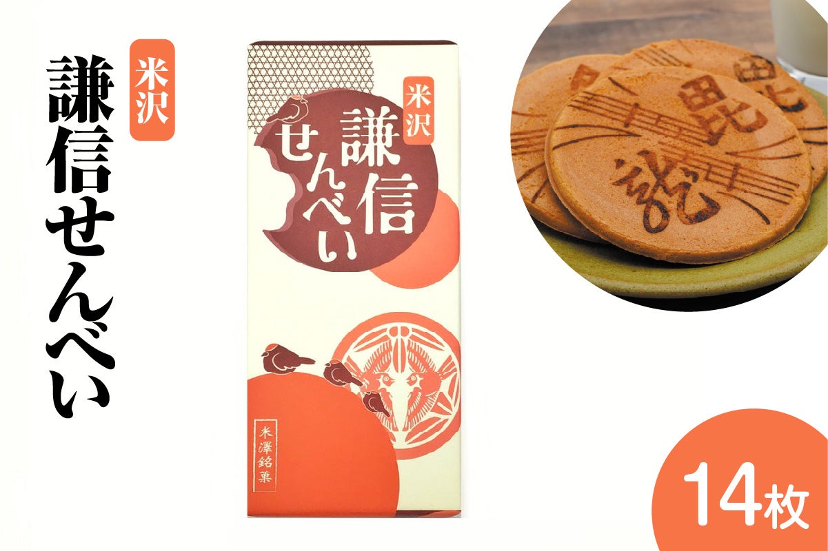 愛されて80余年。やさしい甘さで、香ばしく、なつかしい味わいの「謙信せんべい」。昔ながらの製法で、一枚一枚手作業で焼き上げています。表面に上杉軍の軍旗「毘」と「龍」の文字を焼印で刻んでいます。