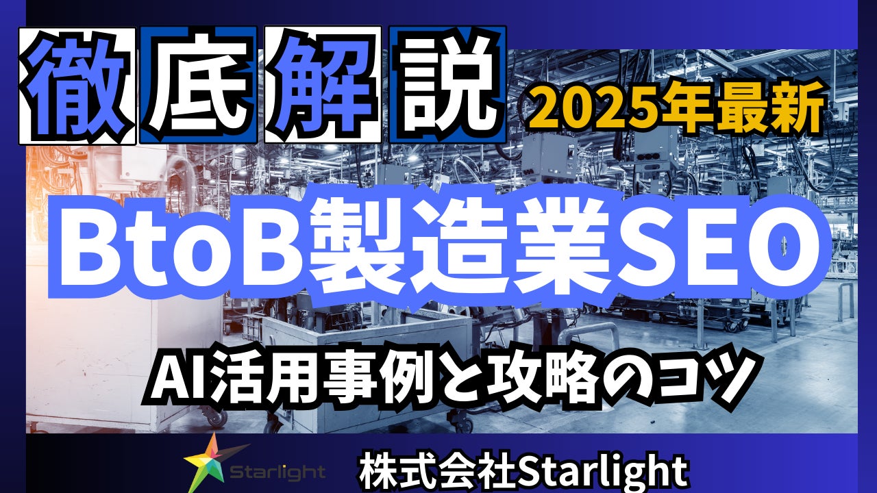 株式会社Starlight(本社:東京都豊島区、代表取締役社長:黒田 真乃介、以下「当社」)は、BtoB製造業界の皆様を対象に「2025年版 BtoB製造業界向けAI×SEOトレンドレポート」を公開いたしました。本レポートはBtoB製造業界がSEOを活用して集客を強化するための最新事例や成功パターン、そして成果に直結する戦略的なAI×SEOノウハウを一冊に集約しています。