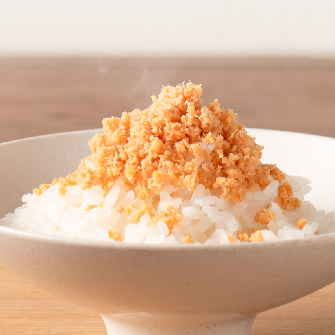鮭フレークは、手作業で丁寧に骨を取り除きながらほぐした鮭を、気仙沼の地で加工しています。食感にもこだわり、明太子の辛みが鮭フレーク全体にまんべんなく行きわたるよう、ふわっとした口当たりに仕上げました。