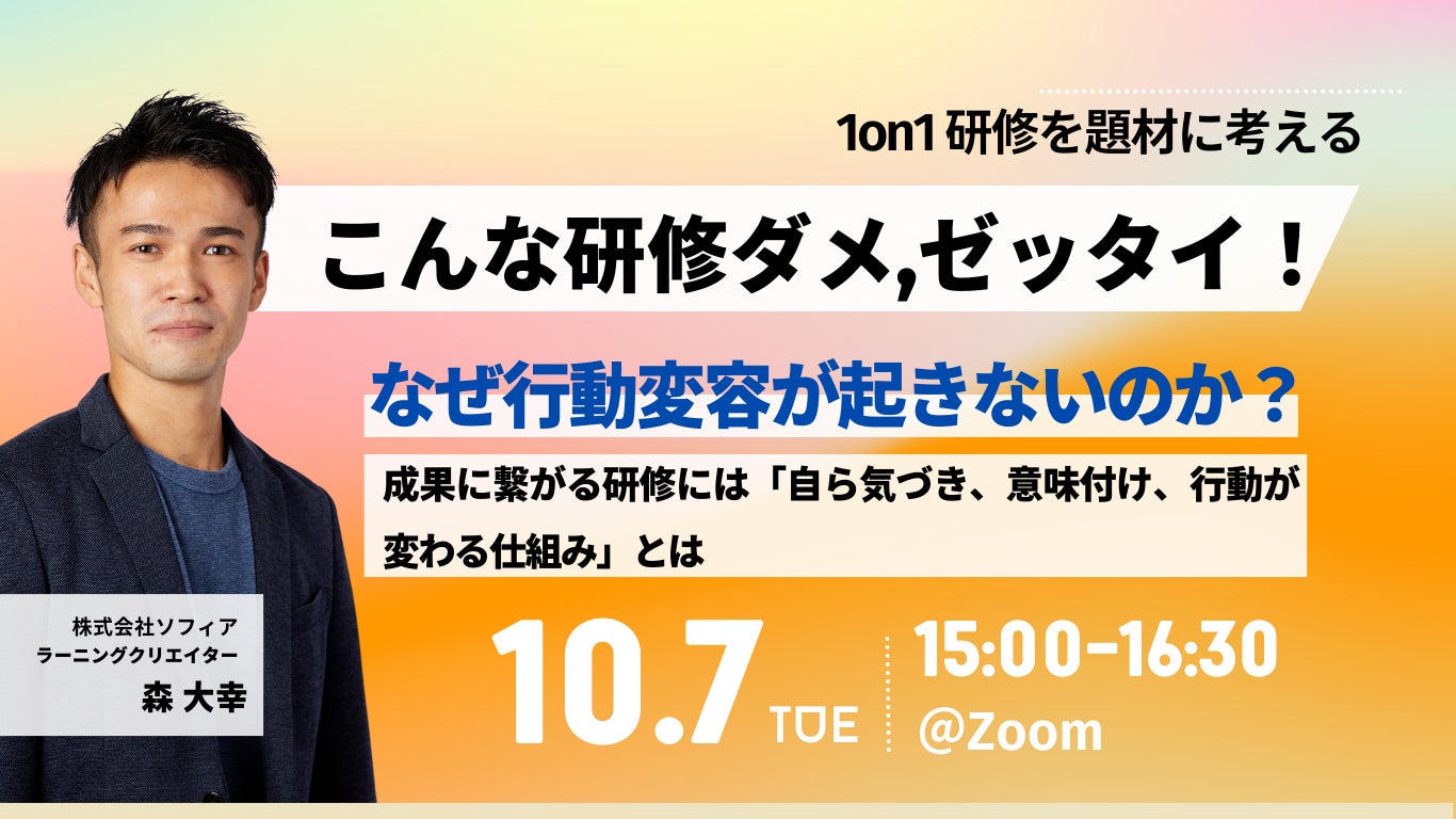 本セミナーでは、ソフィアが提供する「1on1研修」を題材に、学びを“実際の行動”にまでつなげる研修設計のポイントを解説します。