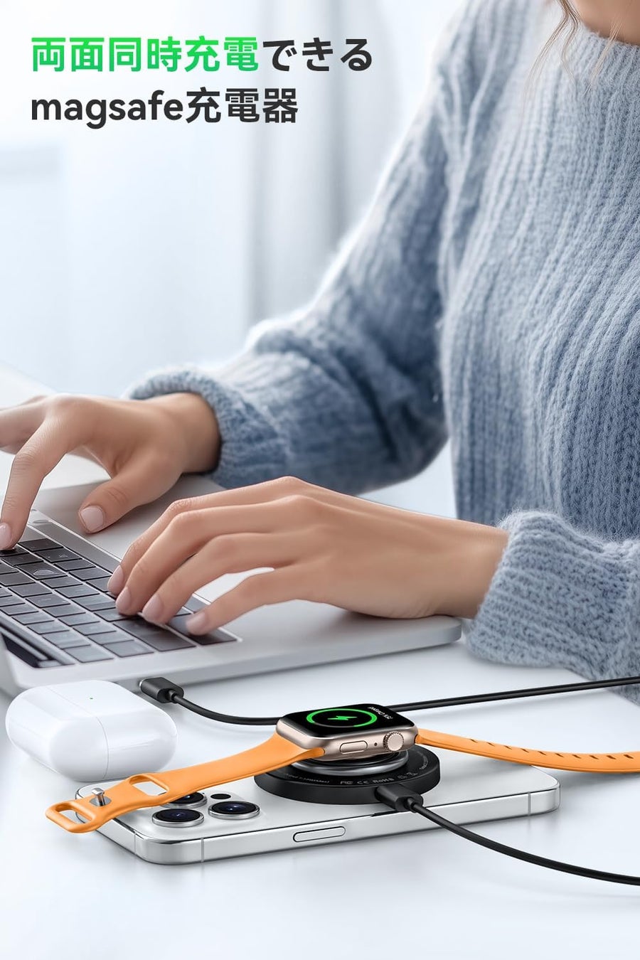 Appleユーザーに特化したデザインで、iPhone・AirPods・Apple Watchをこれ1台で同時に充電。表側にiPhoneとAirPods、裏側にApple Watchが対応し、デスク上でも旅行先でも配線のごちゃつきから解放され、スマートな充電環境を実現します。