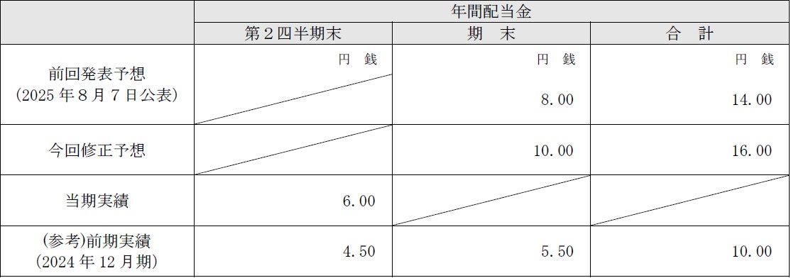 2025年12月期の期末配当予想については、「1.連結業績計画の修正について」で述べた業況及び当社グループの財政状態等を総合的に勘案し、1株当たり2円増配の10.0円に修正いたします。