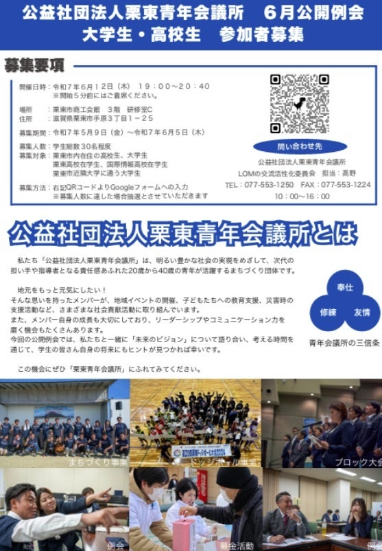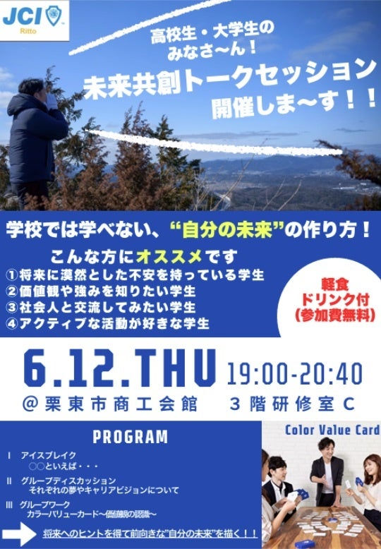 公益社団法人栗東青年会議所は6月公開例会を通して参加していただく学生に自身の将来や価値観と向き合い、青年会議所メンバー(青年経済人)とそれぞれ共有していくことで自分自身の今後のビジョンをより前向きに捉えていただくことを目的に開催いたします。