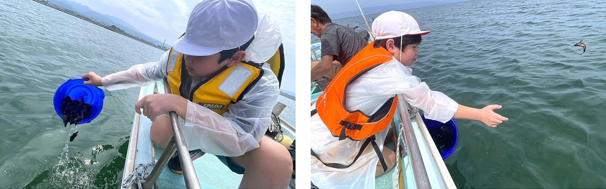 ある程度陸から離れたら、いよいよ放流します。「このまま海に放していいの?」「ちゃんと海に帰っていけるの?」と、最初はちょっぴり不安そうな子どもたちでしたが、漁師の方のサポートのおかげでしっかりと海に返してあげることができました。最後には「大きくなってねー!」「ばいばーい!」と声をかけてあげながら稚魚たちを見送りました。