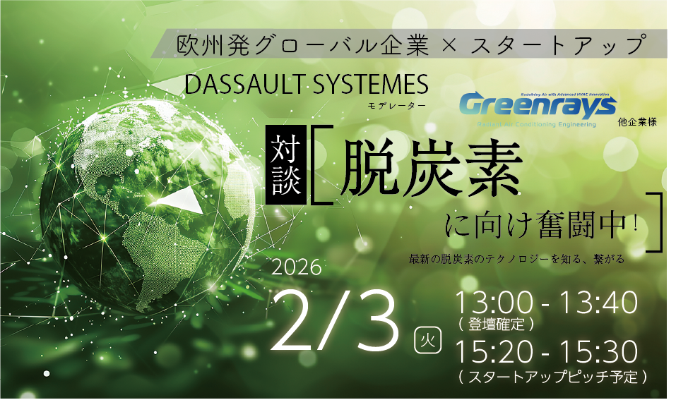 本セッションには、輻射空調技術を軸に建築・都市分野の脱炭素化に取り組む株式会社グリーンレイズ輻射空調エンジニアリング、自然原理と計算デザインを融合した設計手法を開発するNature Architects株式会社、そして、デジタルツインおよび設計プラットフォームを通じて製品・建築・都市の設計と最適化を支えるダッソー・システムズ株式会社 が登壇します。