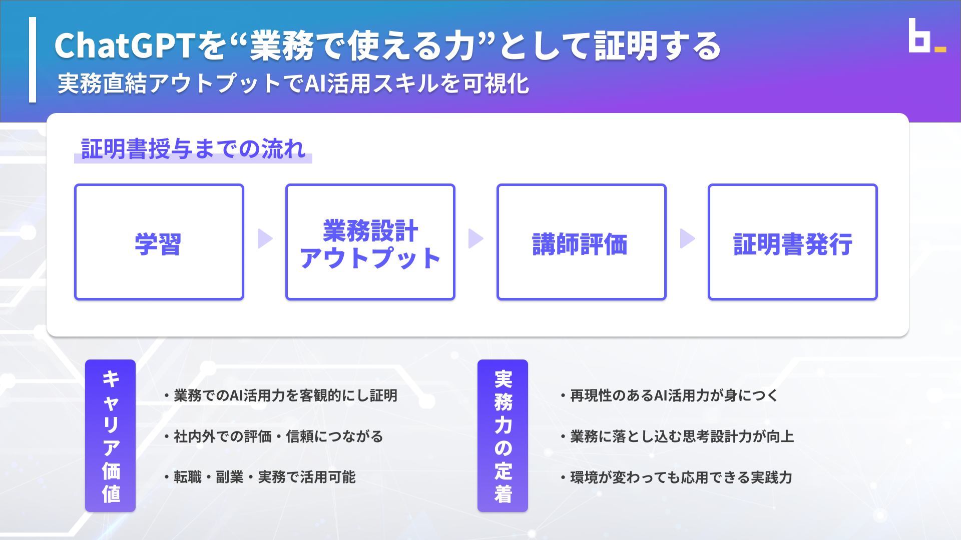 本課題は、ChatGPTを用いた実践的なアウトプットに取り組むことで、初級・中級・上級それぞれのレベルに応じた「仕事で使えるChatGPT活用力」を客観的に証明できる制度です。