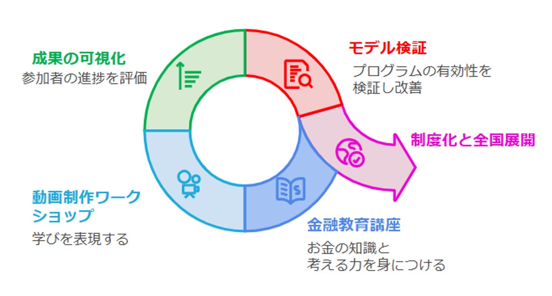 さらに、本事業で得られた成果を基にプログラムのモデル化を進め、全国展開が可能な金融教育事業としての制度化を目指します。