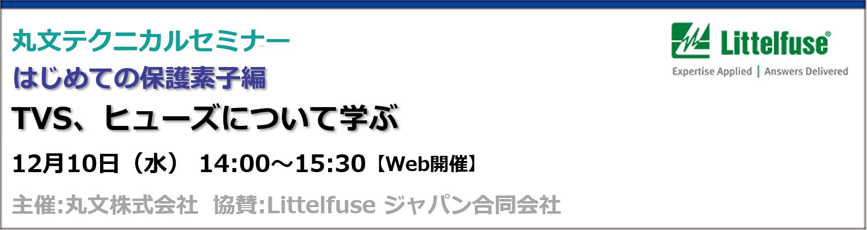 エレクトロニクス商社の丸文株式会社(代表取締役社⻑ 兼 CEO / COO︓堀越裕史、本社: 東京都中央区、以下、丸⽂)は、12月10日(水)にTVS、ヒューズをテーマとして解説する無料のオンラインセミナーを開催します。