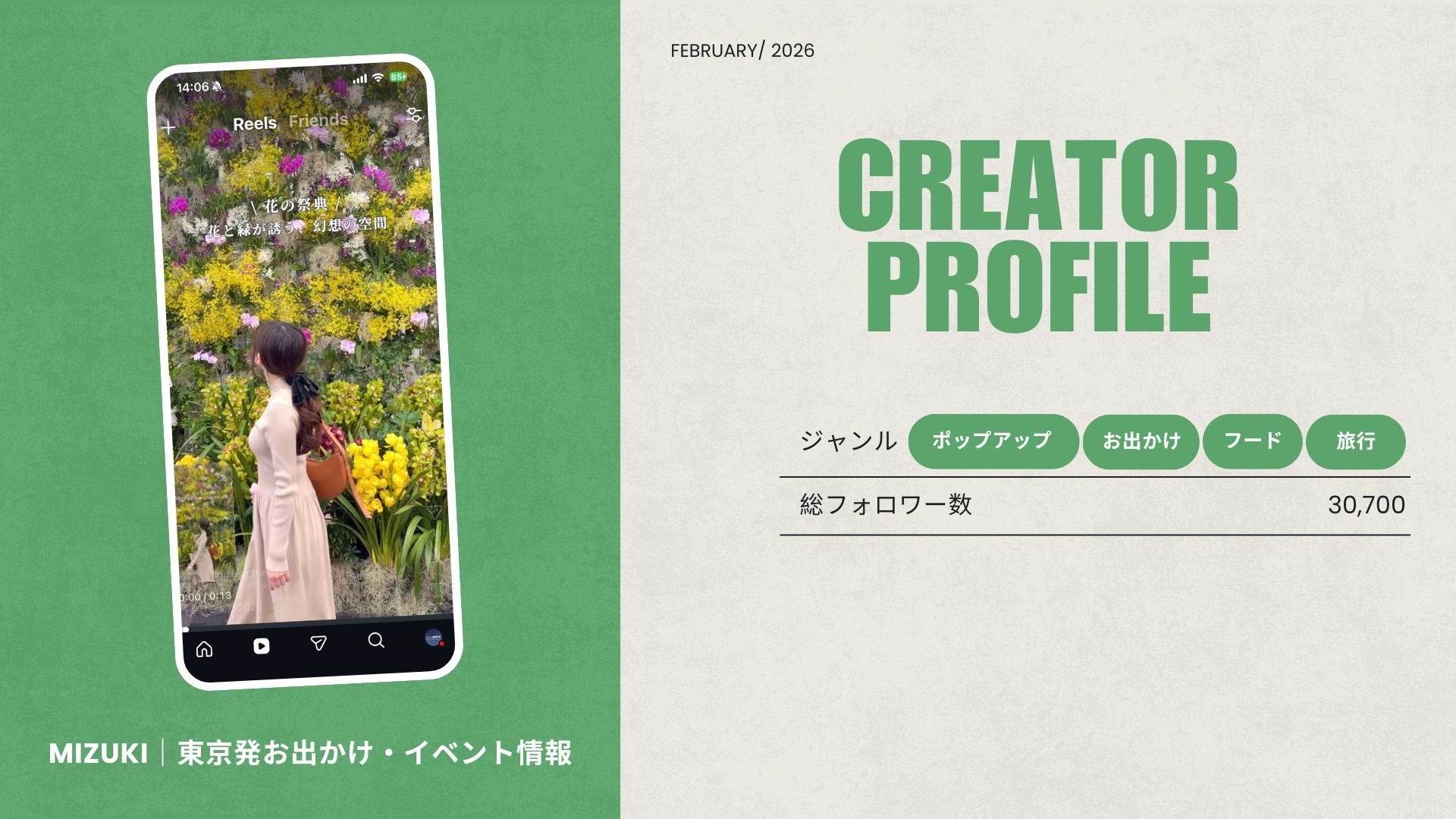 「MIZUKI|東京発お出かけ・イベント情報」は、都内を中心にスポットやポップアップなどの取材を行い、動画の制作・発信をしています。これまでの投稿の中には、再生回数257万回を超える動画もあり、高い発信力を有しています。企業・ブランドが実施するポップアップイベントや、お出かけスポットの認知拡大および来場促進が期待できます。