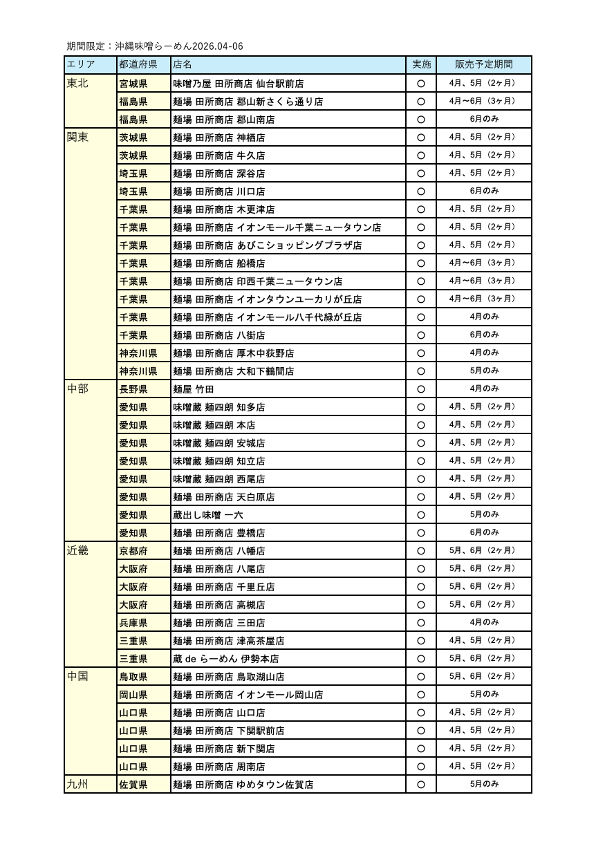 株式会社トライ・インターナショナル(本社:千葉県千葉市、代表取締役社長:田所 史之)が運営する味噌らーめん専門店「麺場 田所商店」は、2026年4月1日(水)より全国の対象店舗にて、沖縄の食文化を取り入れた期間限定商品「沖縄味噌らーめん」の販売を開始しましたのでお知らせします。