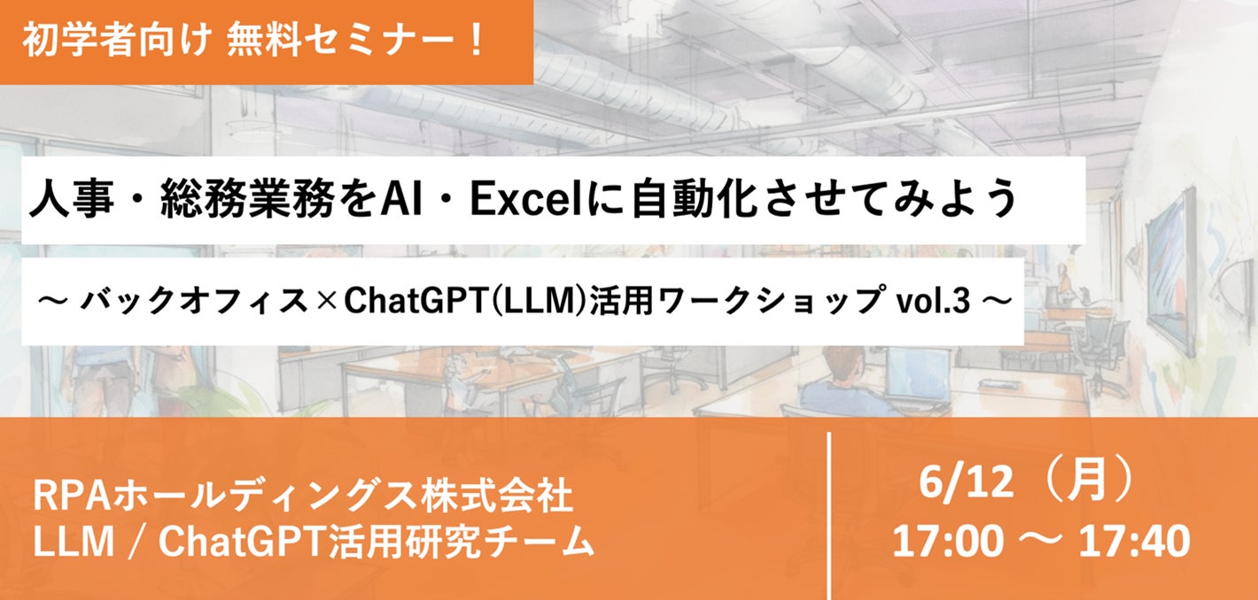 RPAホールディングス株式会社(本社:東京都港区、代表取締役:高橋 知道、以下「RPAホールディングス」)は、無料のオンラインセミナー「人事・総務業務でAI・Excelを使ってみよう〜バックオフィス×ChatGPTワークショップ vol.3〜」を開催致します。