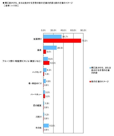 また、「既に秋の行楽に出かけた」「これから秋の行楽に出かける予定である」166名に、行楽というと何を最も強くイメージするかと単一回答形式で聞いたところ、最も多かったのは「紅葉狩り」75.3%、続いて「フルーツ狩り・味覚狩り」12.0%、「温泉」5.4%という結果になりました。このように実際に出かける行楽の内容と行楽のイメージとの間には、少しずれがあることが明らかになりました。