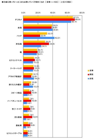 秋の行楽に持っていった(または持っていく予定の)ものを、行楽に出かけた(または出かける予定である)166名に複数回答形式で尋ねたところ、トップは「デジカメ」67.5%、2位は「水筒」39.2%、続いて「バッグ」32.5%、「弁当箱」29.5%「靴」18.7%、「ピクニックマット」14.5%、「クーラーバッグ」13.9%となりました。「水筒」「弁当箱」「ピクニックマット」「クーラーバッグ」などが上位にきていることから、外食ではなく、手作りの弁当を持参するといった傾向がうかがえます。