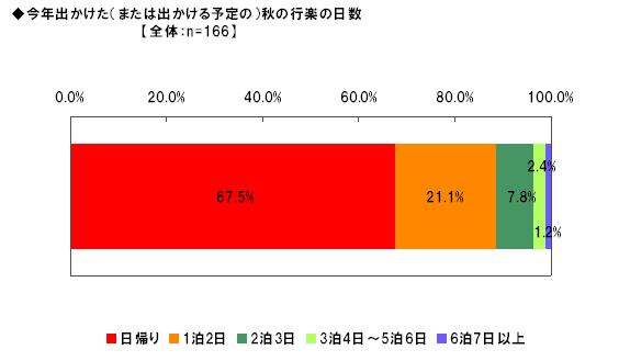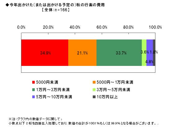 この秋の行楽に出かけた、または出かける予定である166名に、出かけた(または出かける予定の)行楽の日数を聞いた質問では(単一回答形式)、「日帰り」67.5%、「1泊2日」21.1%と、今年秋の行楽の主流は「日帰り」という結果になりました。特にこれから出かける予定の人(99名)では、「日帰り」の回答が74.7%を上っています。また、行楽にかける1人当たりの予算は(単一回答形式)、「5000円未満」が34.9%、「5000円~1万円未満」21.1%となり、56.0%が「1万円未満」という結果となりました。秋の行楽は日数が短く、費用も「1万円未満」程度に抑えた比較的手軽なレジャーとして楽しまれている実態が浮かびあがりました。
