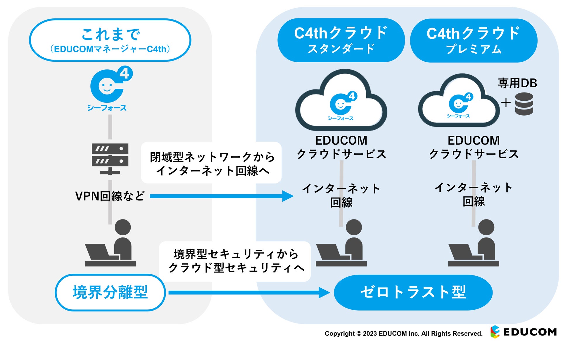 全国の小・中・高等学校に学校支援システムを提供する、ベネッセグループの株式会社EDUCOM(読み:エデュコム、本社:愛知県・東京都、代表取締役CEO兼COO:小林 泰平 、以下EDUCOM)が販売する統合型校務支援システム(*1)「EDUCOMマネージャーC4th」(読み:エデュコムマネージャーシーフォース、以下C4th)は、クラウド版の新サービス「C4thクラウドスタンダード」「C4thクラウドプレミアム」をリリースします。長年学校現場で利用される中で先生方の要望を取り入れ進化してきた「C4th」の各機能が、インターネットエリアから直接利用可能(*2)となります。