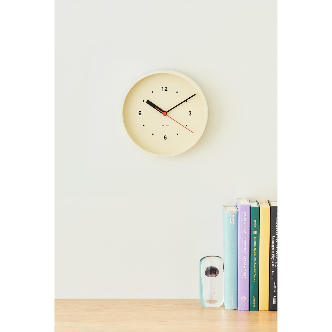 unicoらしい遊び心のあるデザインながら、落ち着いたカラーリングとウッドのフレームがお部屋に馴染み、時間を見るのが楽しくなる時計です。アイボリーとブルーの2色展開。