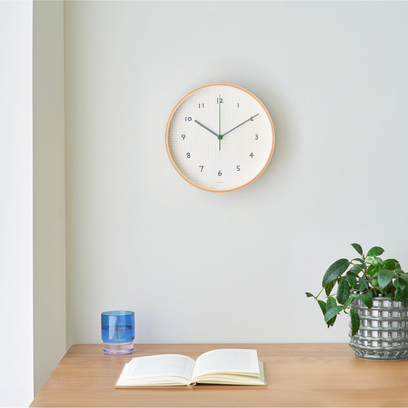 オリジナルデザインの壁掛け電波時計。方眼紙に手書きで描いたような数字や、秒針の差し色がポイント。商品名の「NOTATO」も「ノート」に由来しています。