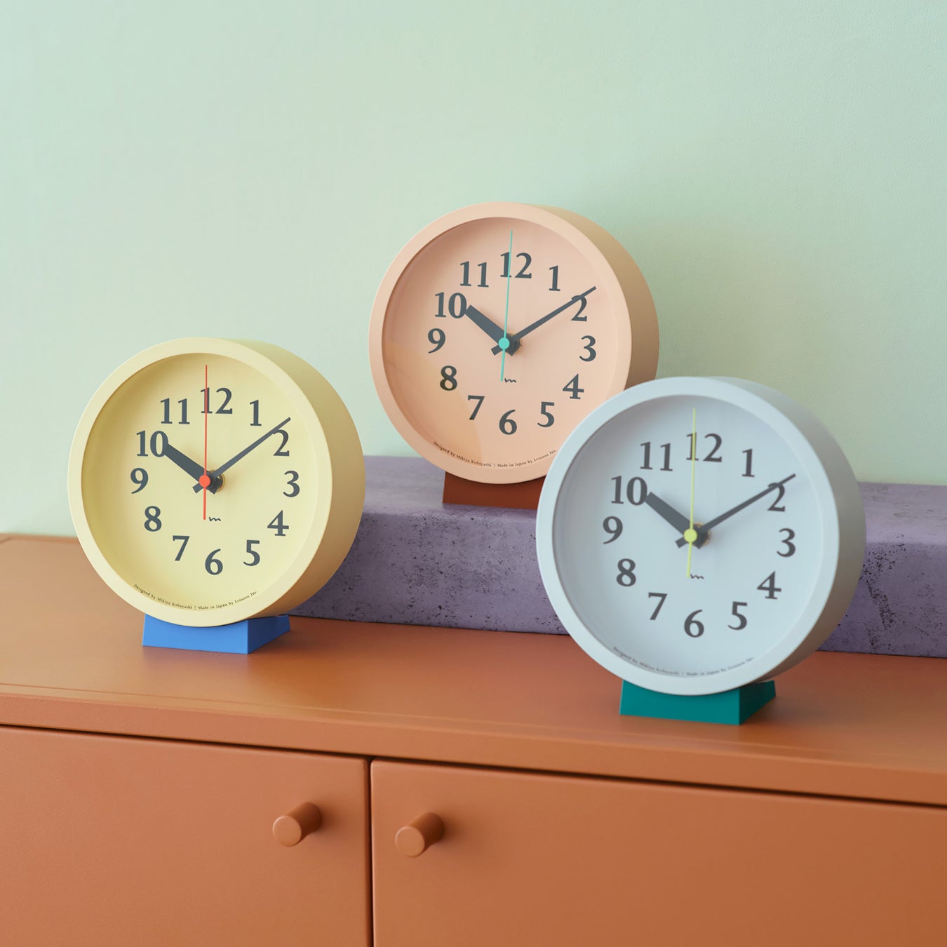 直径20cmと小ぶりなサイズ感で、専用スタンドと組み合わせて置き時計としても使えます。アイボリーとグリーンの2色展開。