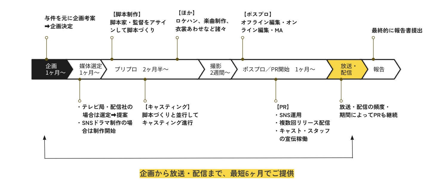 企画から放送・配信に至るまで、最短で約6ヶ月でご提供可能です。媒体選定、脚本作成、プロモーション戦略など、全てを丸ごとお任せください。