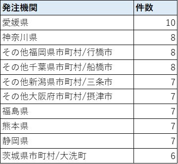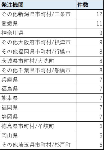 2022年1月から2023年3月までの助成金・補助金公告の上位発注機関の件数です。「愛媛県」が最多となる10件となり、主な公告は原油価格・物価高騰対策などがありました。次いで「神奈川県庁」、「福岡県行橋市」、「千葉県船橋市」、「新潟県三条市」となりました。