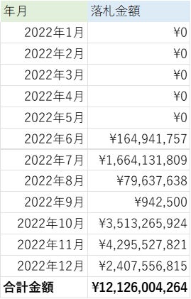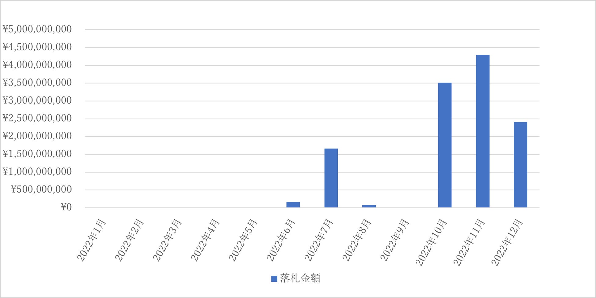 2022年1月から12月までの落札件数を月別で見ていくと、6月に最初の落札が行われ、以降9月までは一桁台でしたが、2022年10月から大幅に増加、12月まで連続して10件以上の落札が行われました。