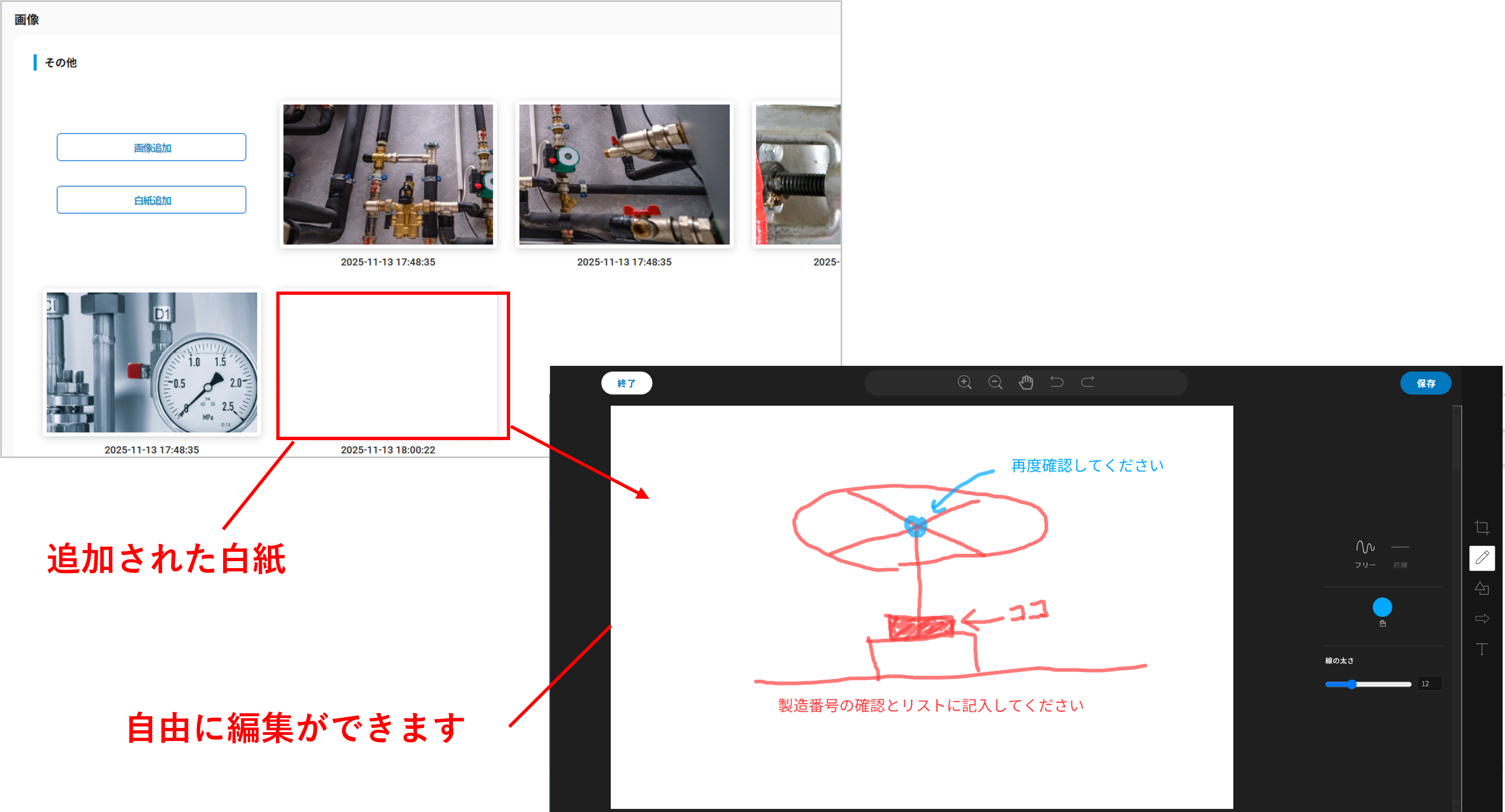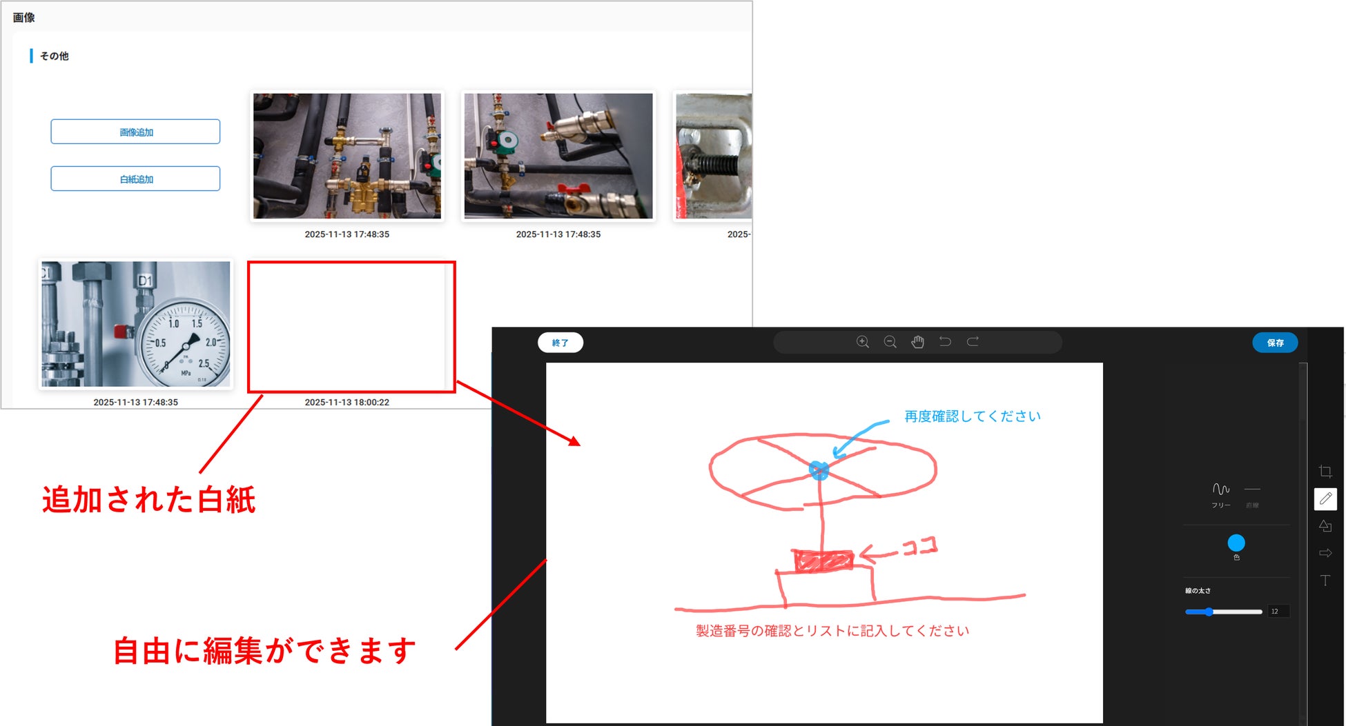 現場で撮影した写真を一時的にストックし、後から適切な実施記録へ振り分ける機能や、白紙のキャンバスに手書きで図やメモを描ける機能を追加しました。