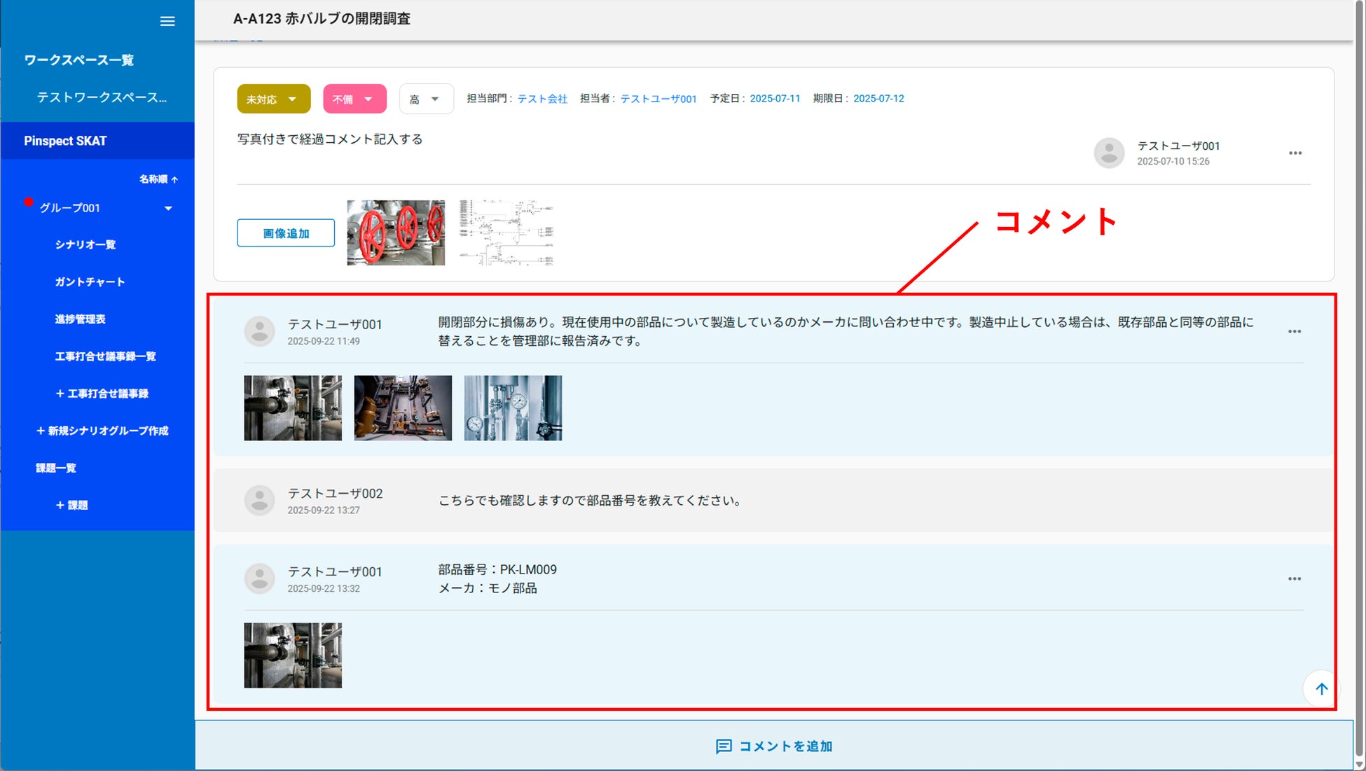 現場作業では、計画された点検項目以外にも、突発的な設備の異常や改善が必要な箇所が見つかることが多々あります。電話やメモでの報告では、詳細な状況が管理者に伝わらない、対応状況の進捗を共有できないといった課題がありました。