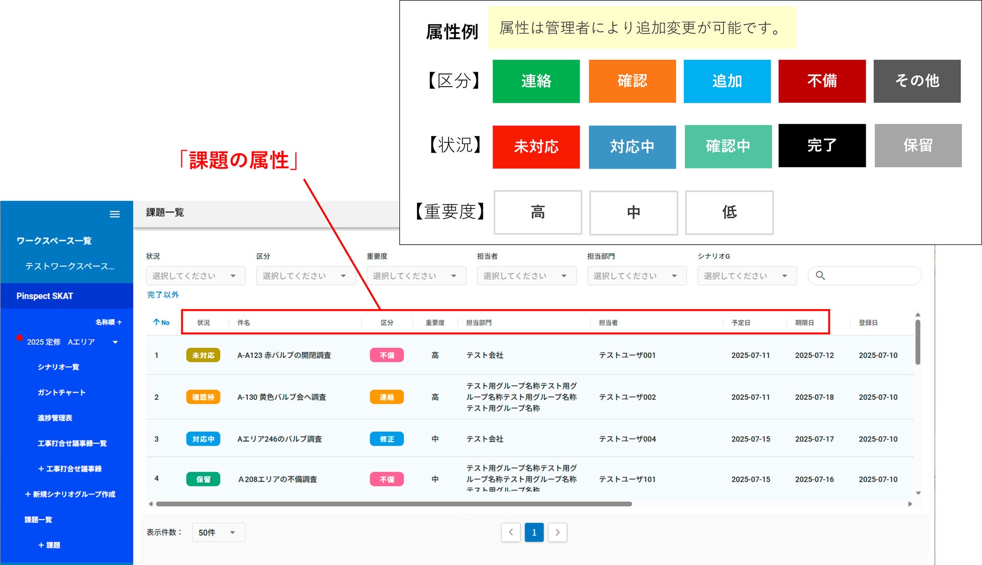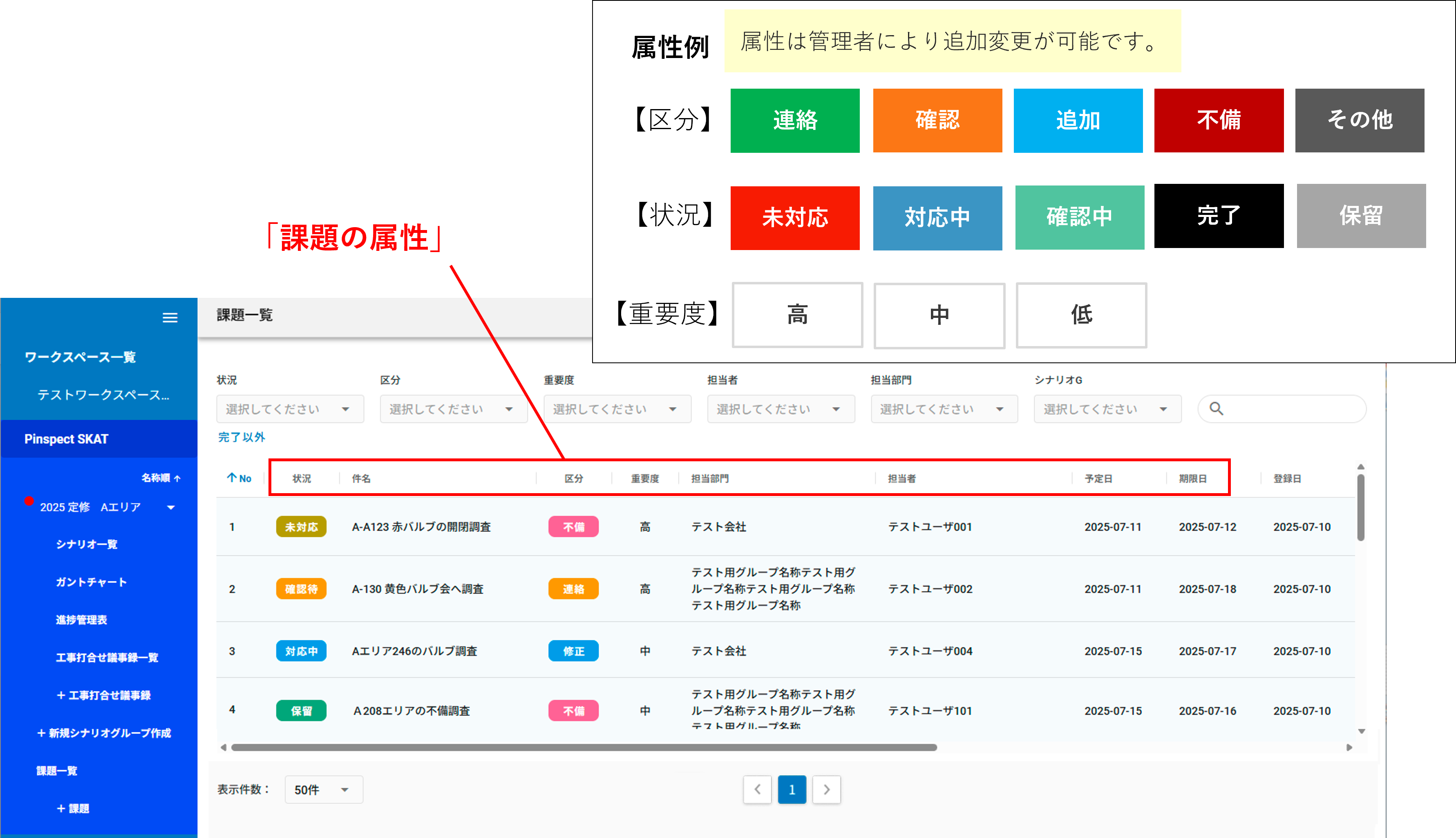「区分」「重要度」「担当者」などの属性を設定し、チーム全体で課題の優先順位や対応状況を把握することができます。
