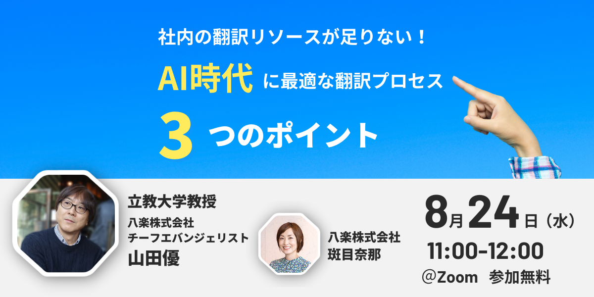 AI+人で生産性を高めるAI自動翻訳プラットフォーム「ヤラクゼン」を提供する八楽株式会社(所在地:東京都渋谷区、代表取締役:坂西優)は、無料オンラインセミナー『AI時代に最適な翻訳プロセス・3つのポイントとは』を2022年8月24⽇(水)に開催いたします。