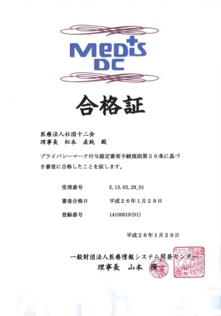 しかしながら、当院における個人情報の取り扱いについて、患者様が認識される機会は多くはなく、その管理方法についてご不安を抱かせているのではないか、との想いから、より安心感のあるクリニックとして認知いただくことを目的に2012年秋より全職員一丸となって「JIS Q 15001:2006/保健医療福祉分野のプライバシーマーク認定指針」に基づいた整備に取り組んだ結果、2014年2月13日に美容クリニックとして≪業界初≫となるPマーク【認定番号:14100019(01) 】の取得となりました。
