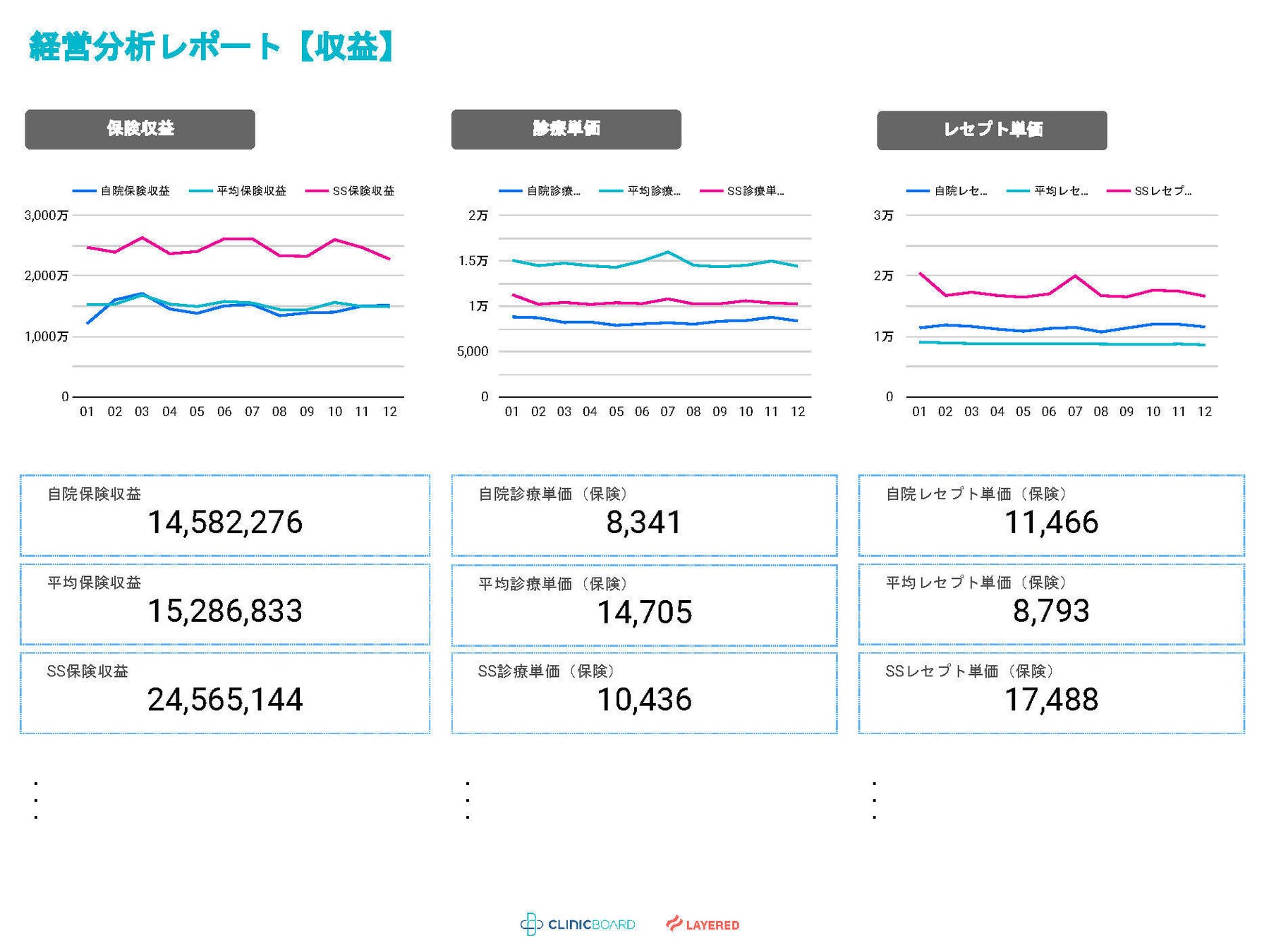 自院のレセプトデータをアップロードし、各種経営数値をまとめます。自院の数値と、『CLINIC BOARD』 に蓄積されたクリニックの経営数値の平均値、および、その中で経営が好調なクリニックの経営数値をベンチマークデータとしてご用意します。クリニック経営数値の平均値は、より自院の状況に即したデ ータと比較できるよう、診療科目や立地条件、経営年数等、自院と近い条件にて抽出し、その平均値をベンチマークデータとして比較し、まとめたレポートを提供します。