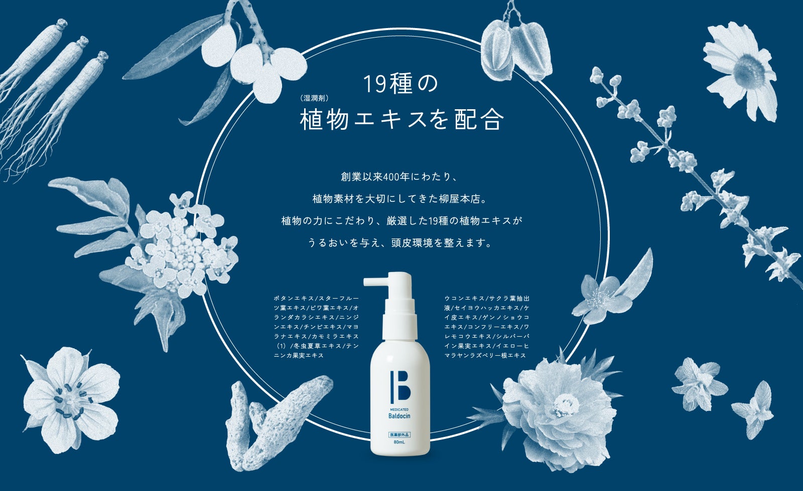 「発毛促進剤 薬用Baldocin(バルドシン)」は、7種の有効成分※1を配合、頭皮に様々なアプローチをして発毛を促進する医薬部外品の育毛剤です。創業以来400年にわたり植物素材を大切にしてきた当社、柳屋本店が植物の力にこだわり、厳選した19種の植物エキス※2がうるおいを与え頭皮環境を整えます。また、生体での脂質のはたらきに着目し発見された成分「NcPA」(環状リゾホスファチジン酸ナトリウム)※3を湿潤剤として配合し、頭皮の水分を保ち頭皮を健やかにします。