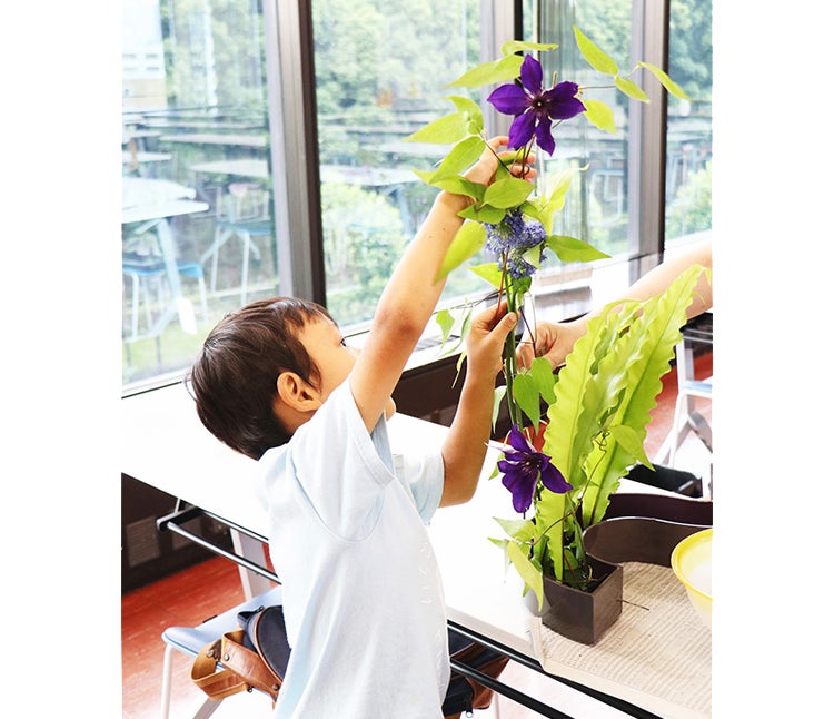 花材と花器を選ぶのも、花をいけるのも子どもたち自身。3、4歳くらいの子たちは大人がサポートしますが、ほとんどの子は最初から最後までひとりで花に向き合います。