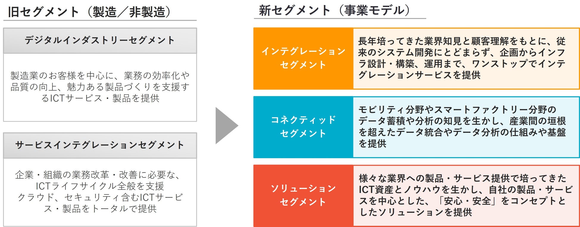「インテグレーション」「コネクティッド」「ソリューション」のセグメントの“強み”である開発力、データ分析/活用、自社商材を掛け合わせた事業モデルへ転換し、多様な顧客ニーズに応えるトータルサービスを提供します。