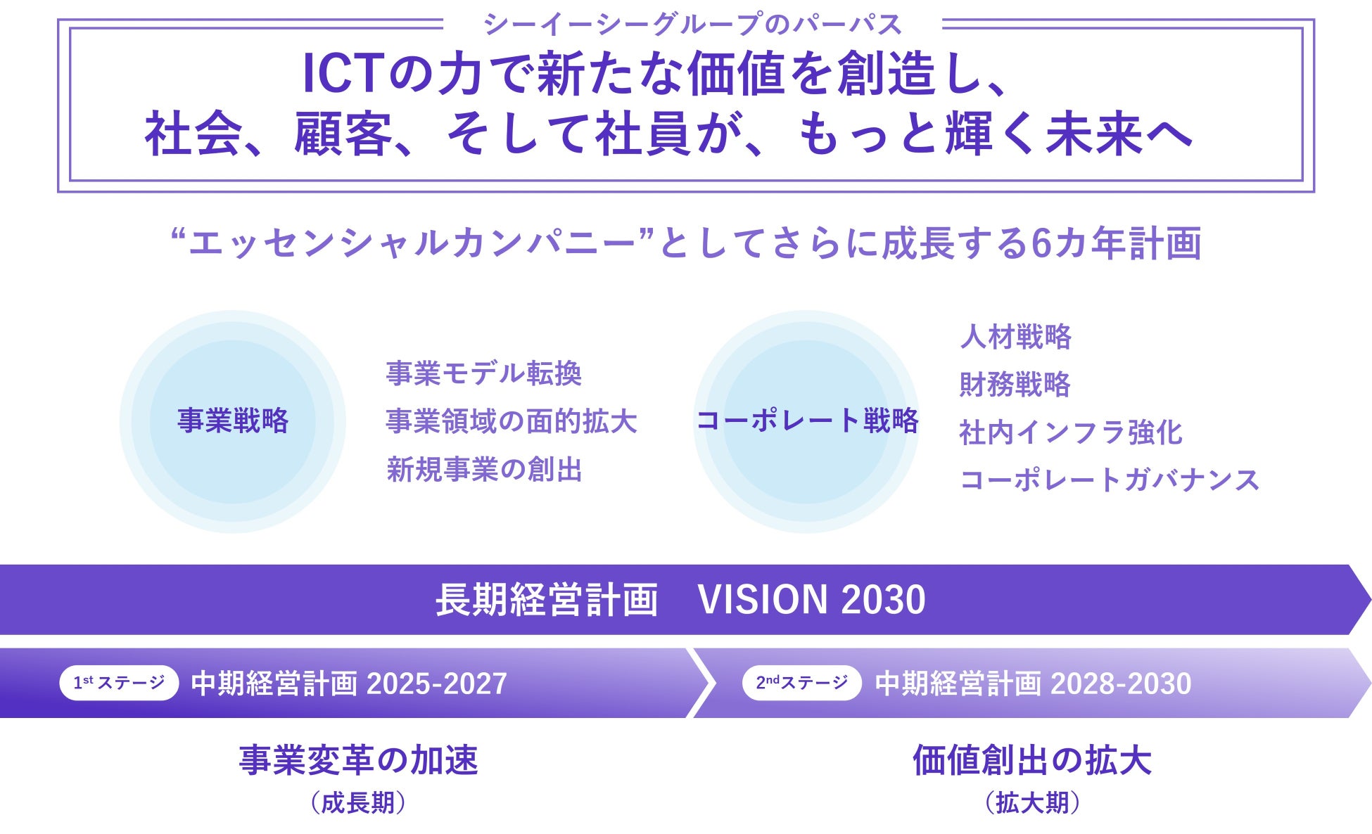 株式会社シーイーシー(本社:東京都渋谷区、代表取締役社長:姫野 貴)は、2030年に目指す姿の実現に向けて、長期/中期経営計画を策定しました。2030年までの6カ年の長期経営計画を「VISION 2030」とし、2025年から2027年までの3カ年の経営計画を「中期経営計画 2025-2027」として策定しましたので、お知らせします。
